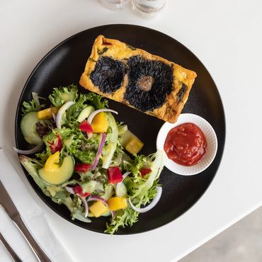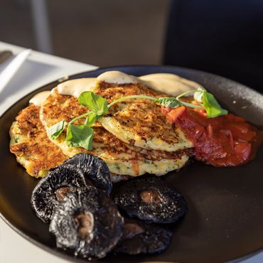 Grilled sweetcorn fritters with homemade salsa, hollandaise, and your choice of bacon or portobello mushroom.